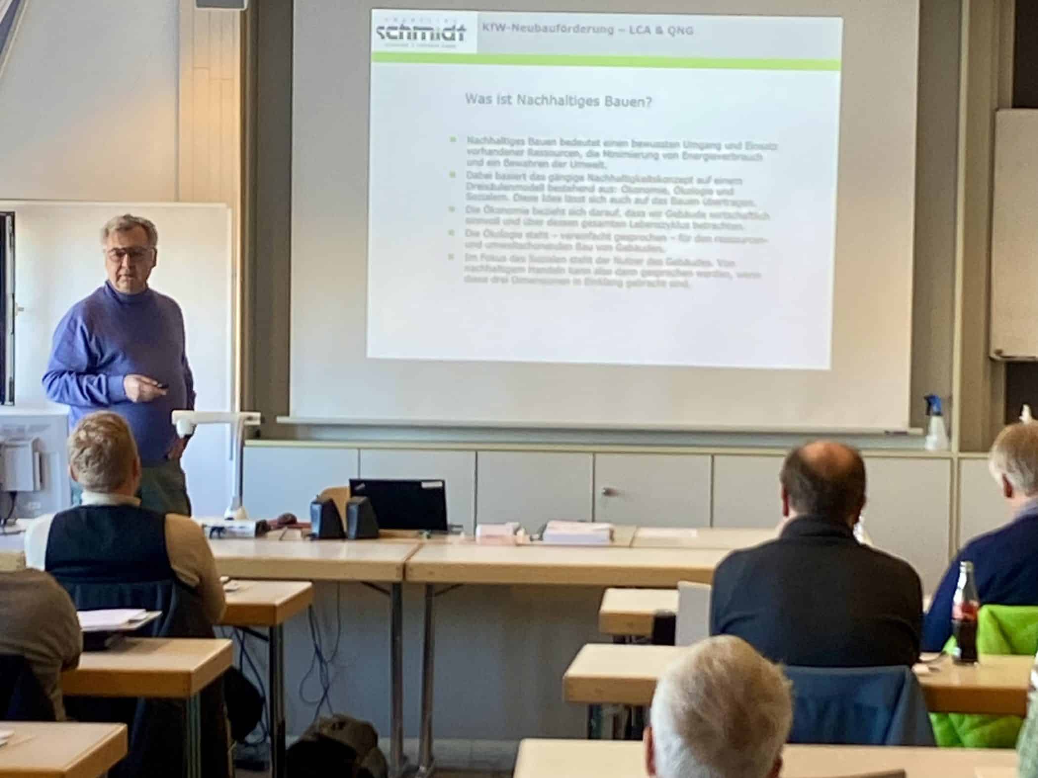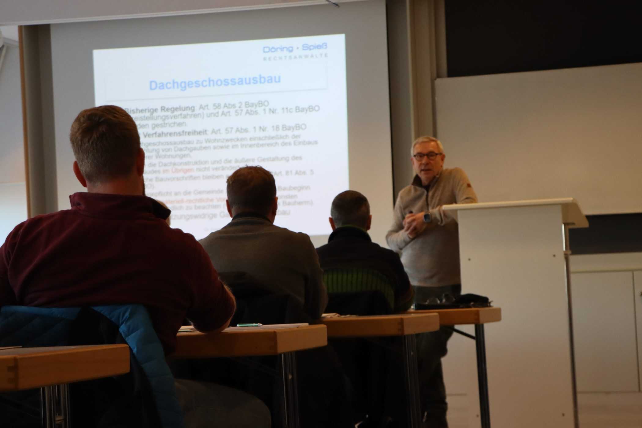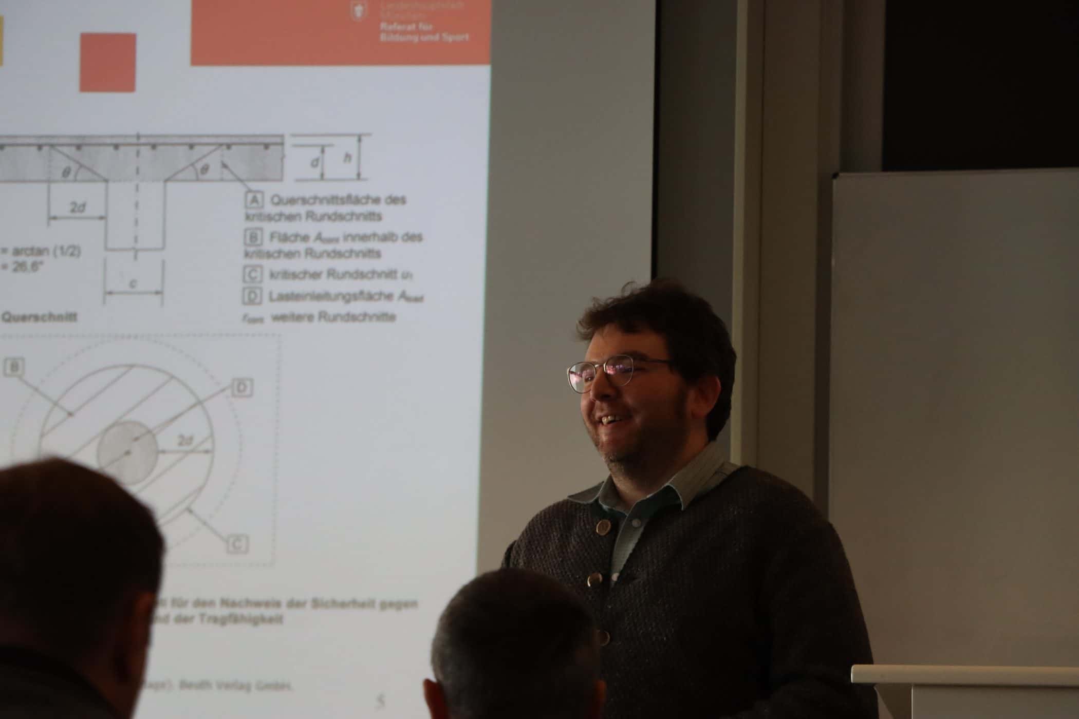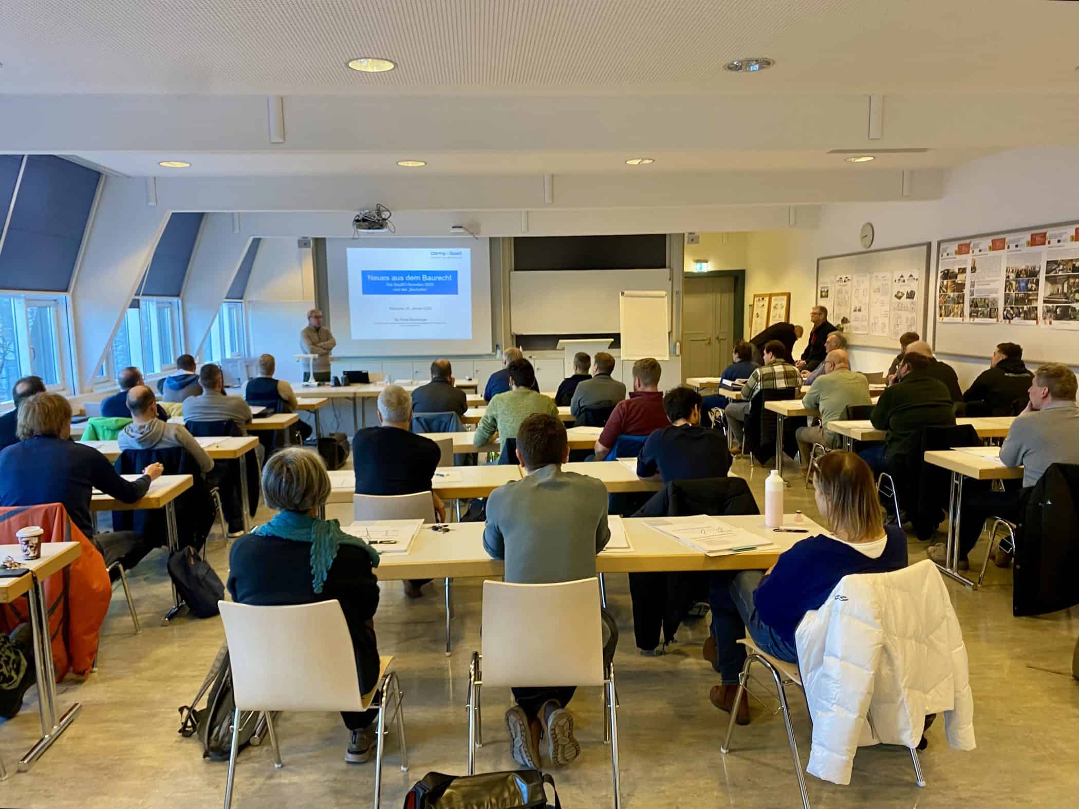 Am Samstag, den 31. Januar 2026 bot der BMB in Zusammenarbeit mit der Fachschule für Bautechnik und der Bauinnung München-Ebersberg einen Fortbildungstag an. Knapp 40 Teilnehmende nahmen dieses Fortbildungsangebot dankend an und das nicht nur, um Anrechnungspunkte zum Erhalt der Zusatzqualifikation (Berechtigung zur Erstellung bautechnischer Nachweise gem. BayBO) oder zur Verlängerung der Eintrag in die EEE_Liste der Dena zu erhalten. Egal ob Baurecht (Thema u. a. der „Bauturbo“), Nachhaltiges Bauen (u. a. LCA und QNG), Statik (Durchstanznachweise) oder Bauphysik (u. a. Schall- und Brandschutzkonstruktionen) – es blieb stets lebendig! Die überaus kompetenten Referenten lieferten ausreichend Input und Praxiserfahrung, die dann mit den Erfahrungen und Nachfragen der Anwesenden zu einem tollen Ergebnis für alle führte. In den Pausen wurden die Diskussionen und das Netzwerken fortgesetzt , so dass alle zufrieden um 16.30 Uhr die Heimreise antreten konnten.