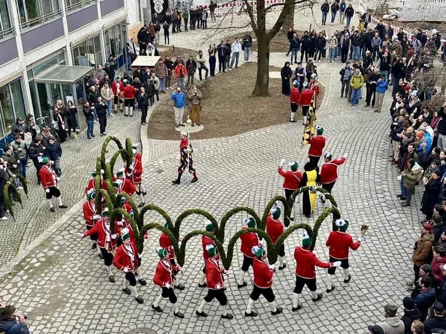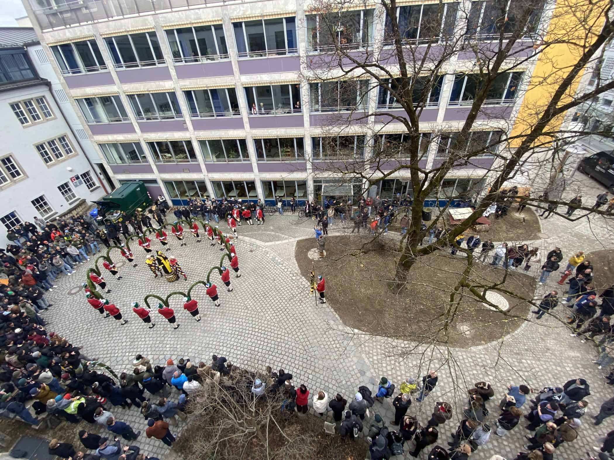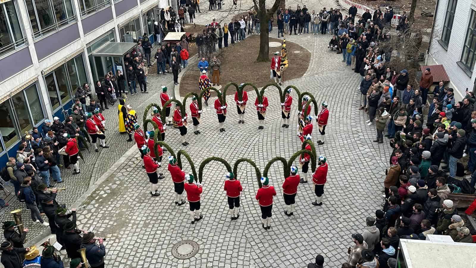 Der diesjährige BMB-Vorstand („Schülervertretung“ der Fachschule für Bautechnik) hat’s geschafft: zum 1. Mal tanzten die Münchner Schäffler im Innenhof unseres unseres Städt. Berufsschulzentrums für das Bau- und Kunsthandwerk! Schäffler/Fasmacher/Böttcher ist ein uralter Handwerksberuf, der in Deutschland laut ausbildung.de nur noch in 35 existierenden Betrieben erlernt werden kann. Die 3jährige berufliche Ausbildung sieht einmal jährlich 2,5 Monate Blockunterricht in Österreich vor.