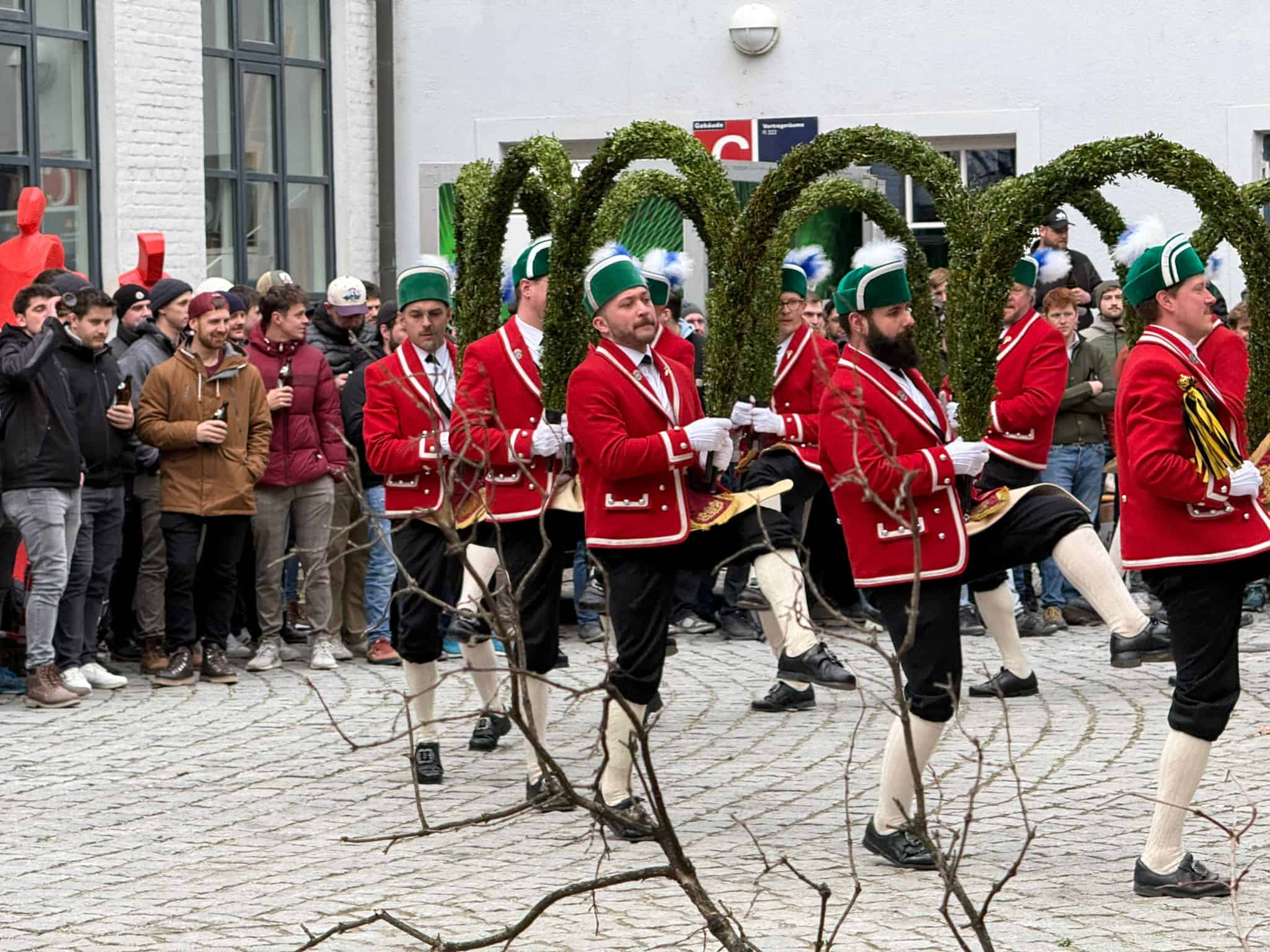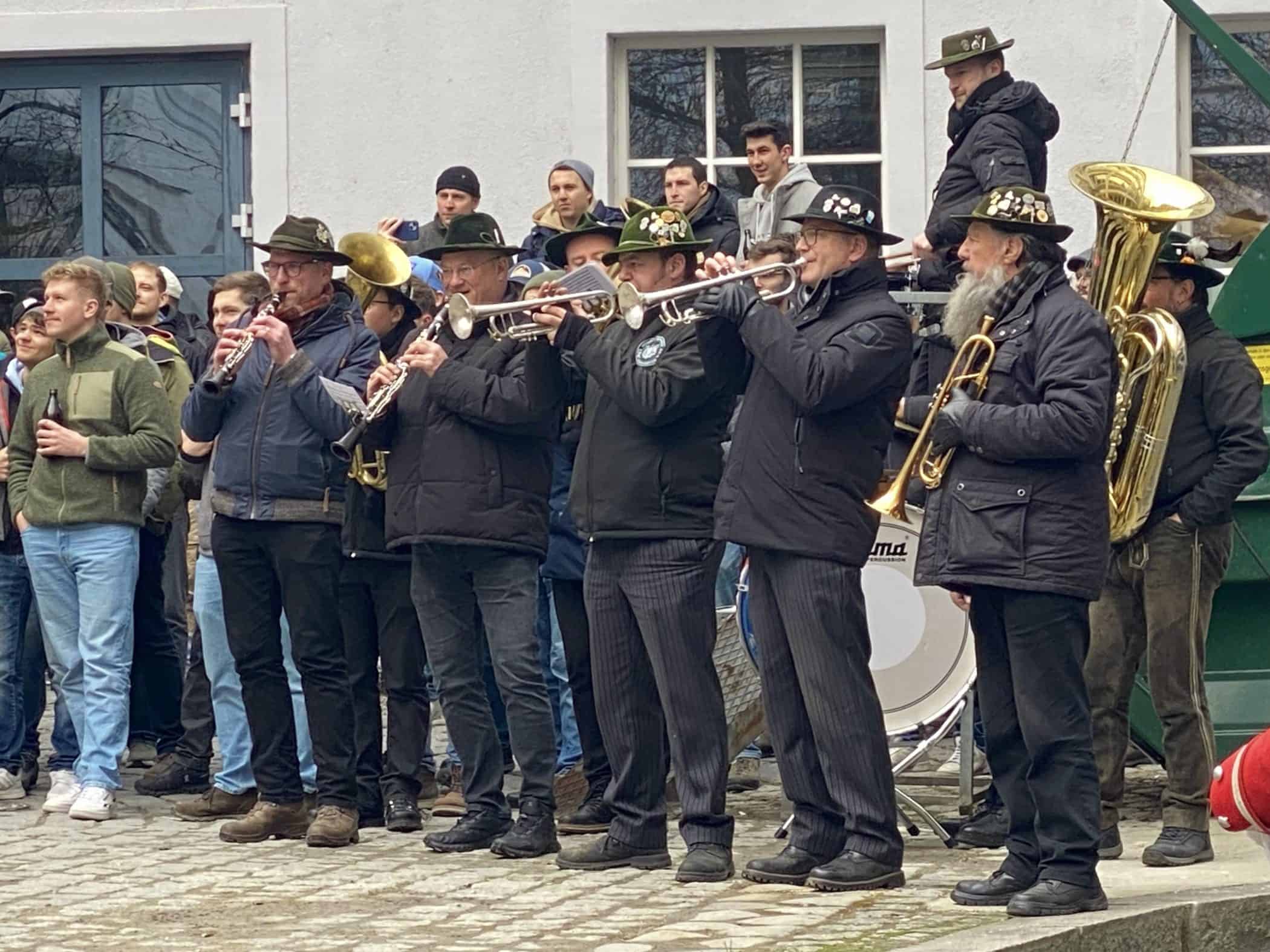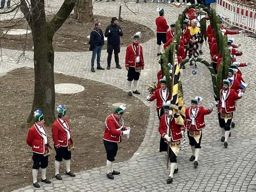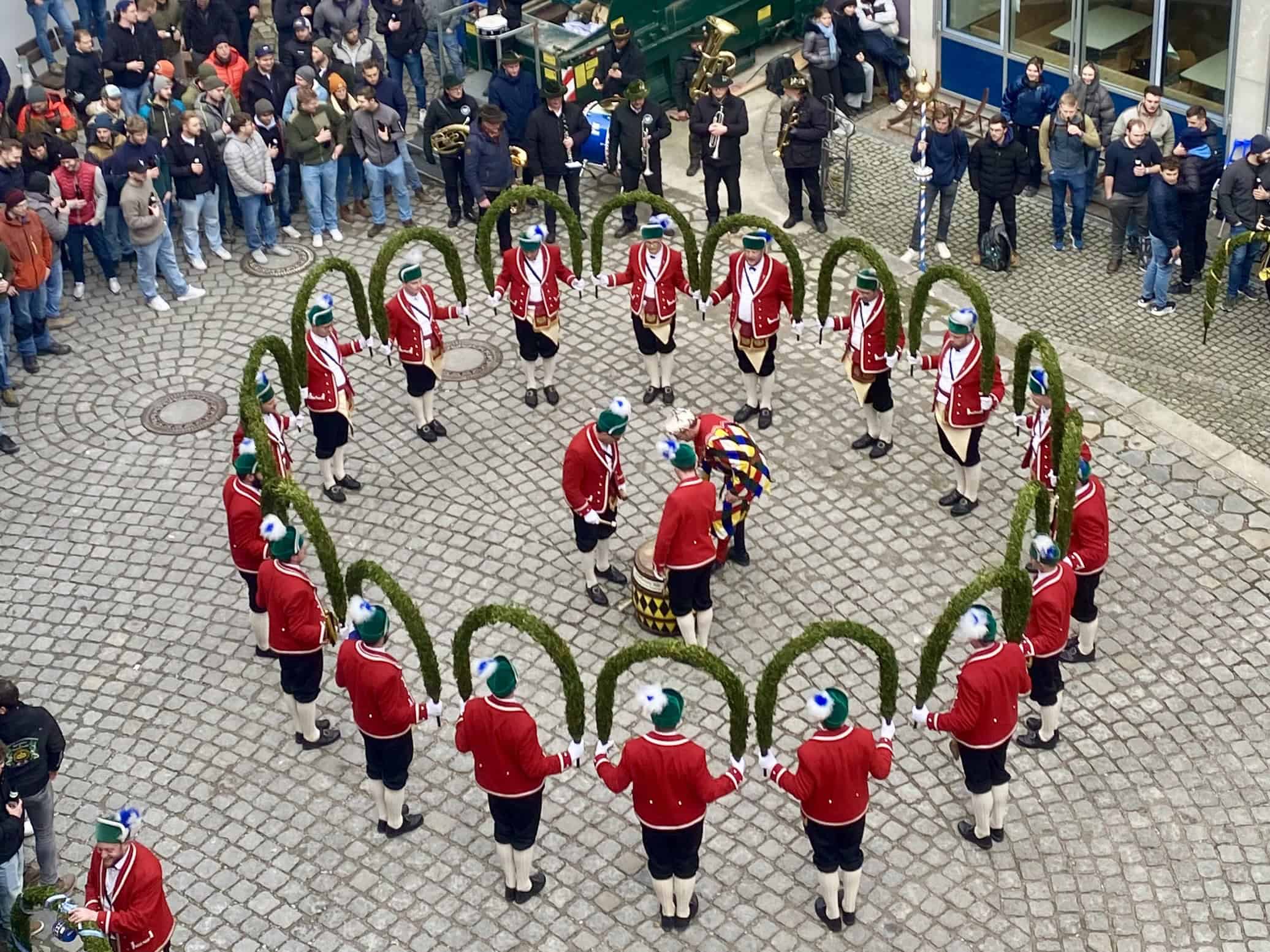 Der diesjährige BMB-Vorstand („Schülervertretung“ der Fachschule für Bautechnik) hat’s geschafft: zum 1. Mal tanzten die Münchner Schäffler im Innenhof unseres unseres Städt. Berufsschulzentrums für das Bau- und Kunsthandwerk! Schäffler/Fasmacher/Böttcher ist ein uralter Handwerksberuf, der in Deutschland laut ausbildung.de nur noch in 35 existierenden Betrieben erlernt werden kann. Die 3jährige berufliche Ausbildung sieht einmal jährlich 2,5 Monate Blockunterricht in Österreich vor.