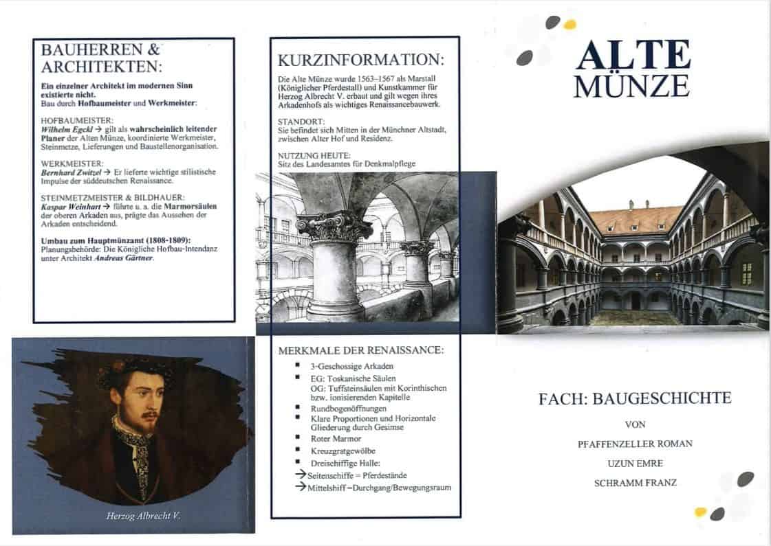 Alljährlich befassen sich die 2. Klassen im Rahmen des Faches Baugeschichte auch mit der Münchner Bau-Historie. Zur Epoche der Ägypter oder der Antike ist München ein weniger gutes Pflaster mit Gebäuden vor Ort, aber die jüngeren Zeitepochen bieten tatsächlich allerhand wunderbare Bauwerke! Die einzelnen Schüler*innen betätigten sich gegenseitig als Stadtführende für ihre Klassen und kamen so u. a. in den Genuss des Teufelsrittes in der Frauenkirche, des Sitzungssaals des Alten Rathauses, der Asamkirche und vielen weiteren Baudenkmälern! Für die „Alte Münz“ beispielsweise wurde auch ein typisches „Info-Faltblatt“ erstellt!