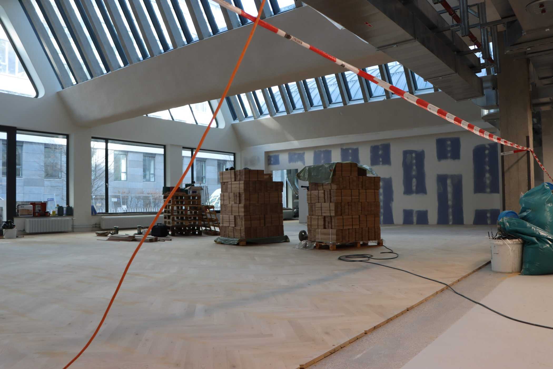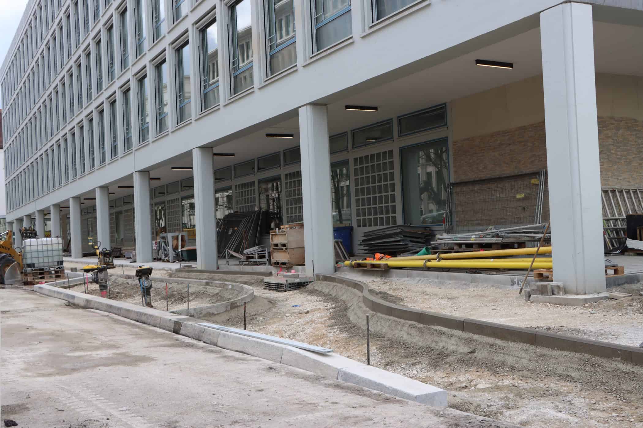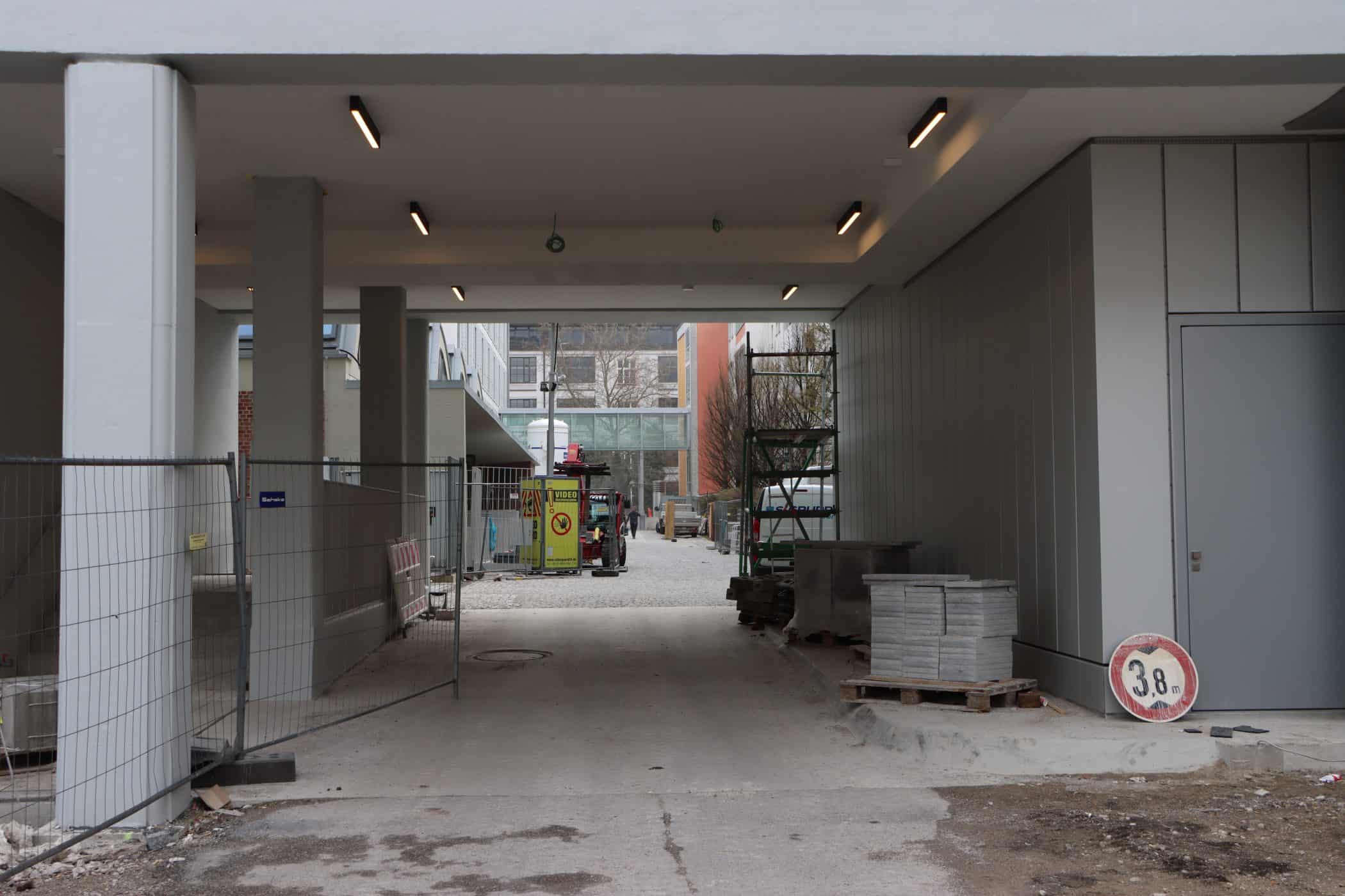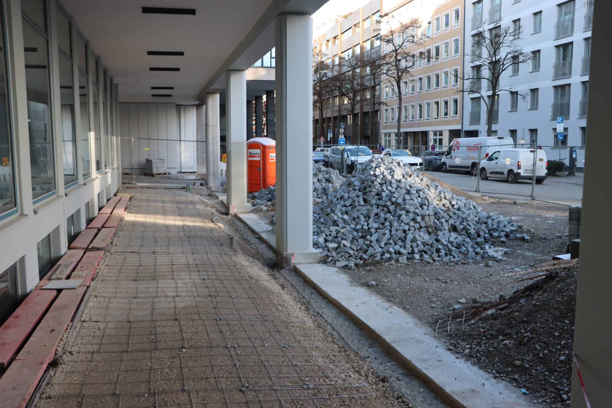 Hier sehen Sie, laufend aktualisiert und in Auszügen, den Fortschritt der Arbeiten im Jahr 2026. Eigentlich sollte es dieses Kalenderjahr in der Chronik der Generalsanierung gar nicht geben, aber vielschichtige Verzögerungen sorgen dafür, dass auch im 125. Jahr seit Eröffnung bau- und kunsthandwerklicher Schulen an diesem Standort noch einige Arbeiten zu begleiten sind. Im Gebäudeteil E findet endlich wieder auf allen Ebenen der Praxisunterricht für Berufs- und Meisterschule statt und somit ist das Kollegium auch endlich wiedervereint! Die Sheddachhalle bekam bis Februar ebenfalls einen Parkettboden. Die Arbeiten an den Außenanlagen (Pflaster, Geh-/Radwege, Brunnen, etc.) sind noch nicht ganz abgeschlossen Mitte März. Als sichtbares Zeichen der Verzahnung von Theorie und Praxis wurde am 18. März der Übergang zwischen Bauteil D und E im 2. OG wieder installiert. Im Gebäude gibt es noch an vielen Stellen „Startschwierigkeiten“, aber der Grundtenor sagt: Wir freuen uns auf ein positives Ende!
