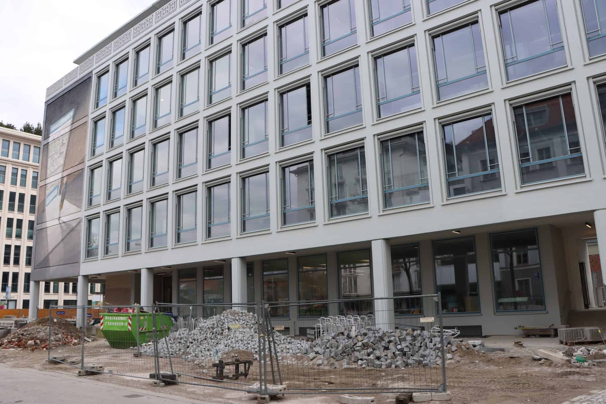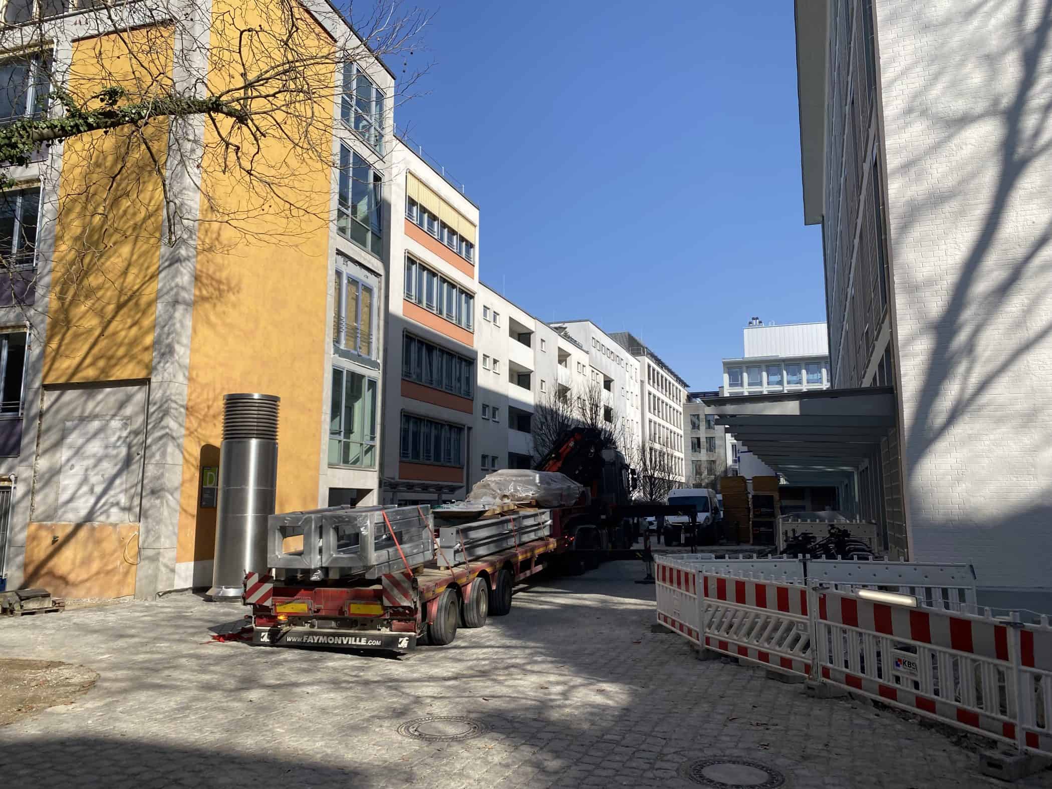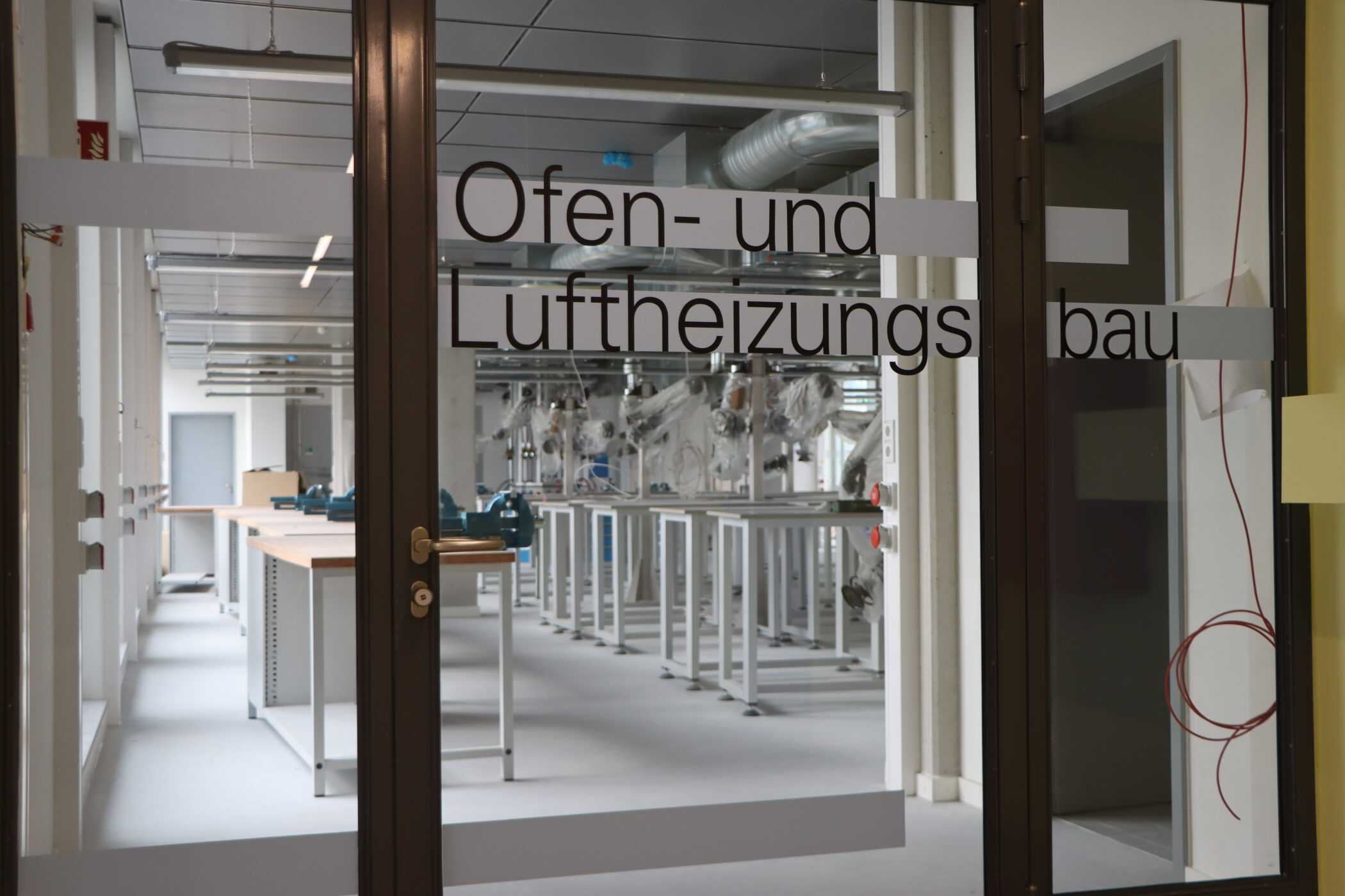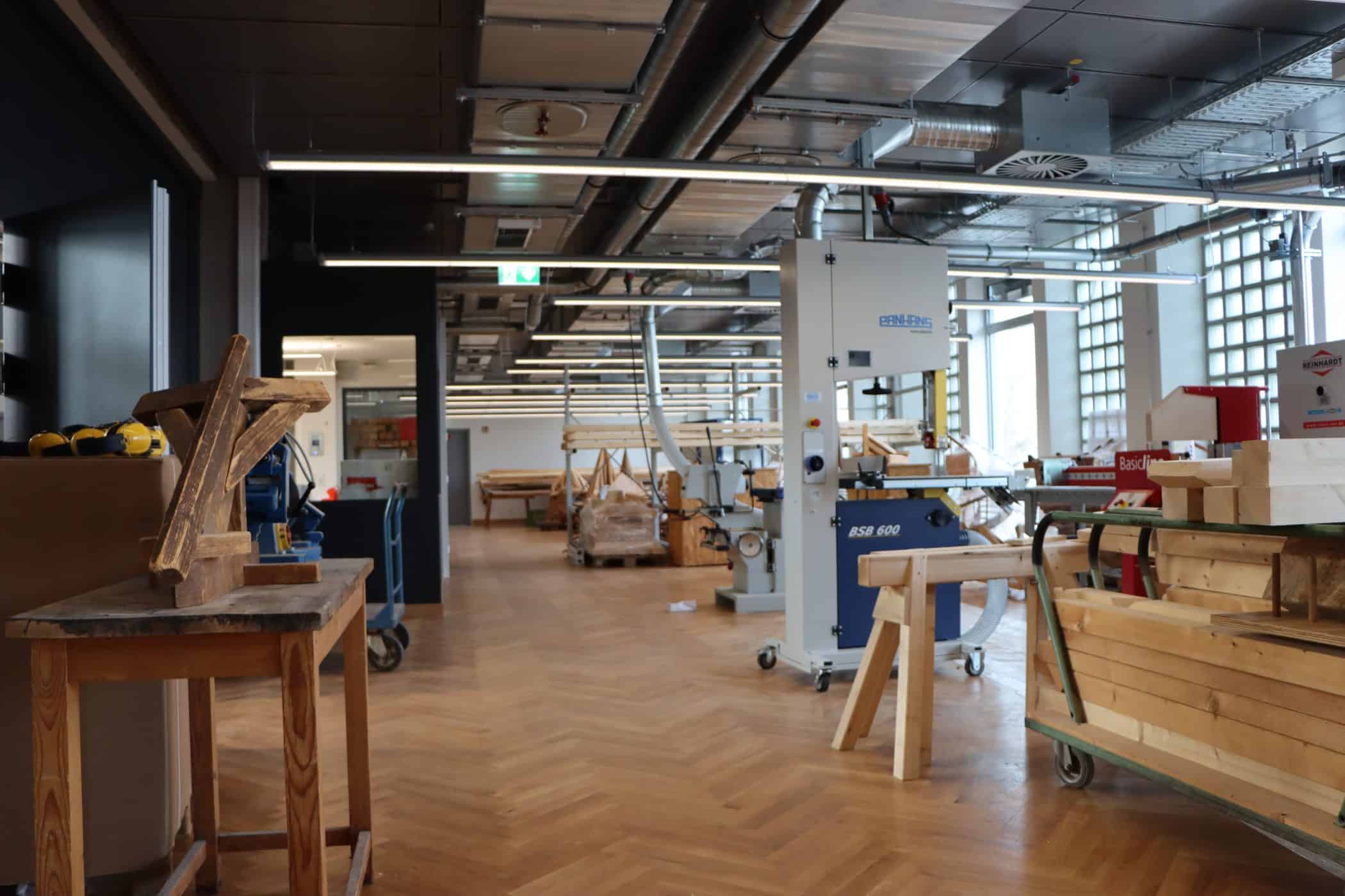 Hier sehen Sie, laufend aktualisiert und in Auszügen, den Fortschritt der Arbeiten im Jahr 2026. Eigentlich sollte es dieses Kalenderjahr in der Chronik der Generalsanierung gar nicht geben, aber vielschichtige Verzögerungen sorgen dafür, dass auch im 125. Jahr seit Eröffnung bau- und kunsthandwerklicher Schulen an diesem Standort noch einige Arbeiten zu begleiten sind. Im Gebäudeteil E findet endlich wieder auf allen Ebenen der Praxisunterricht für Berufs- und Meisterschule statt und somit ist das Kollegium auch endlich wiedervereint! Die Sheddachhalle bekam bis Februar ebenfalls einen Parkettboden. Die Arbeiten an den Außenanlagen (Pflaster, Geh-/Radwege, Brunnen, etc.) sind noch nicht ganz abgeschlossen Mitte März. Als sichtbares Zeichen der Verzahnung von Theorie und Praxis wurde am 18. März der Übergang zwischen Bauteil D und E im 2. OG wieder installiert. Im Gebäude gibt es noch an vielen Stellen „Startschwierigkeiten“, aber der Grundtenor sagt: Wir freuen uns auf ein positives Ende!