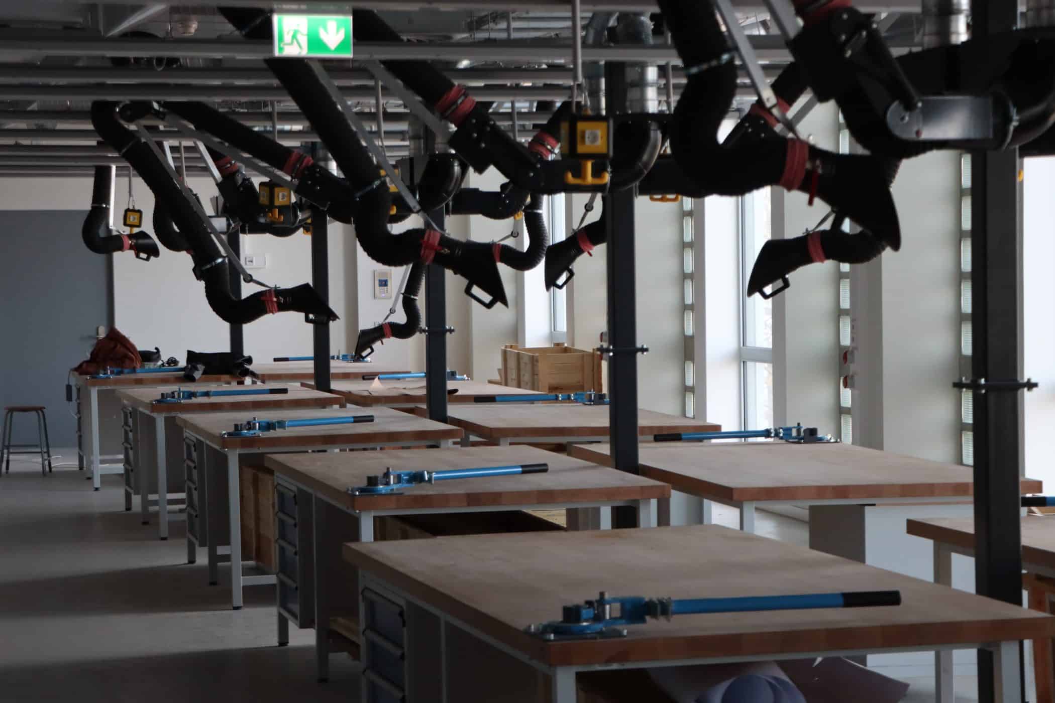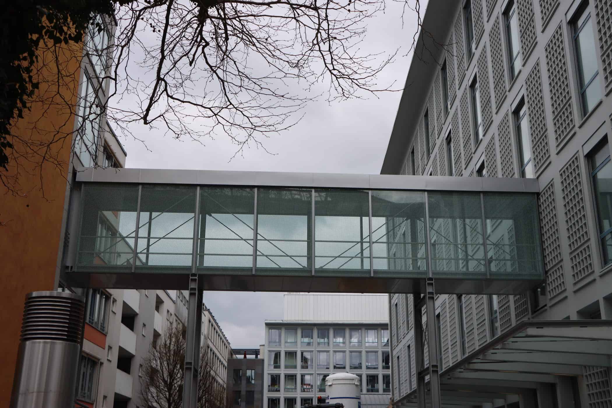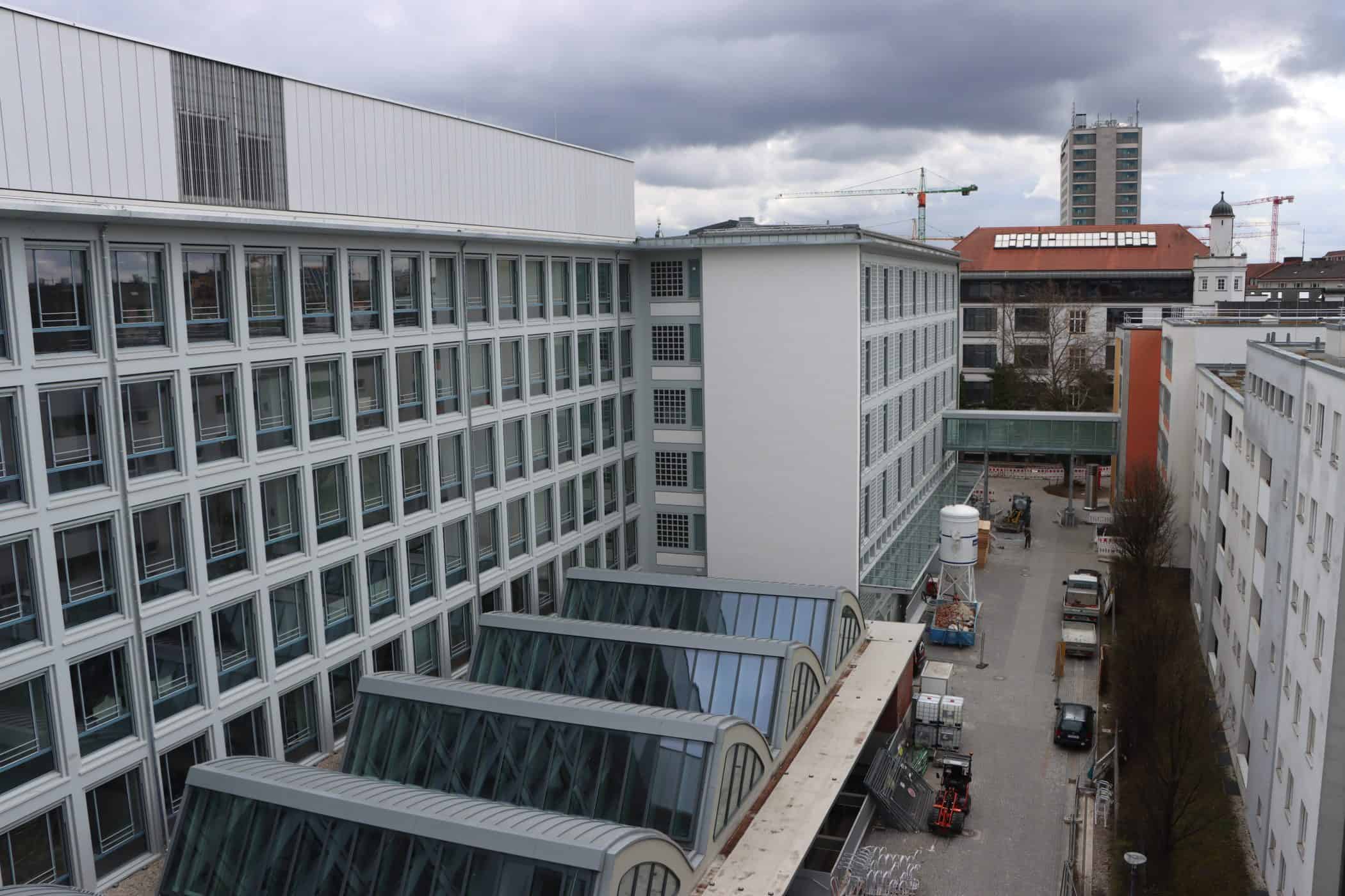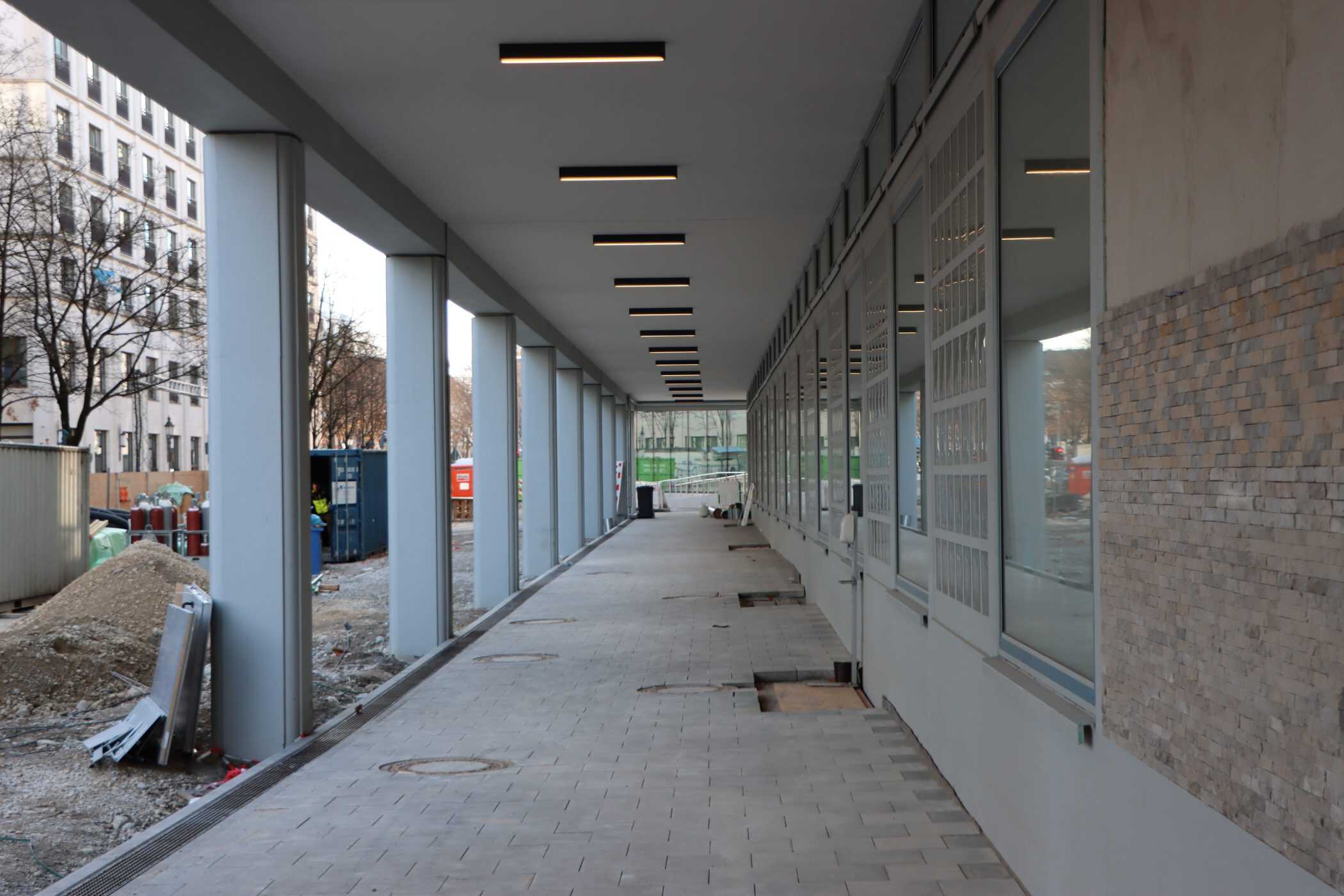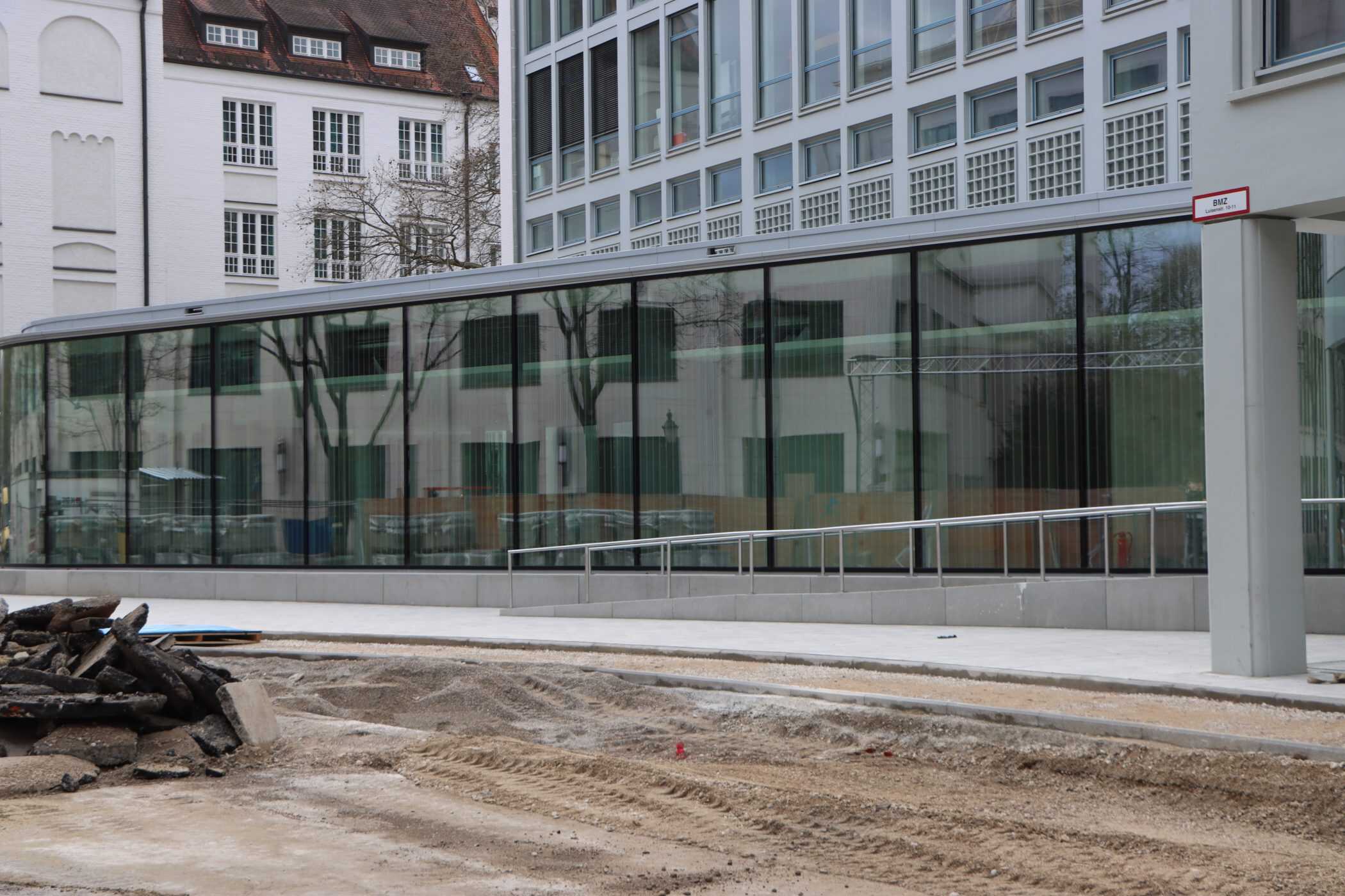 Hier sehen Sie, laufend aktualisiert und in Auszügen, den Fortschritt der Arbeiten im Jahr 2026. Eigentlich sollte es dieses Kalenderjahr in der Chronik der Generalsanierung gar nicht geben, aber vielschichtige Verzögerungen sorgen dafür, dass auch im 125. Jahr seit Eröffnung bau- und kunsthandwerklicher Schulen an diesem Standort noch einige Arbeiten zu begleiten sind. Im Gebäudeteil E findet endlich wieder auf allen Ebenen der Praxisunterricht für Berufs- und Meisterschule statt und somit ist das Kollegium auch endlich wiedervereint! Die Sheddachhalle bekam bis Februar ebenfalls einen Parkettboden. Die Arbeiten an den Außenanlagen (Pflaster, Geh-/Radwege, Brunnen, etc.) sind noch nicht ganz abgeschlossen Mitte März. Als sichtbares Zeichen der Verzahnung von Theorie und Praxis wurde am 18. März der Übergang zwischen Bauteil D und E im 2. OG wieder installiert. Im Gebäude gibt es noch an vielen Stellen „Startschwierigkeiten“, aber der Grundtenor sagt: Wir freuen uns auf ein positives Ende!